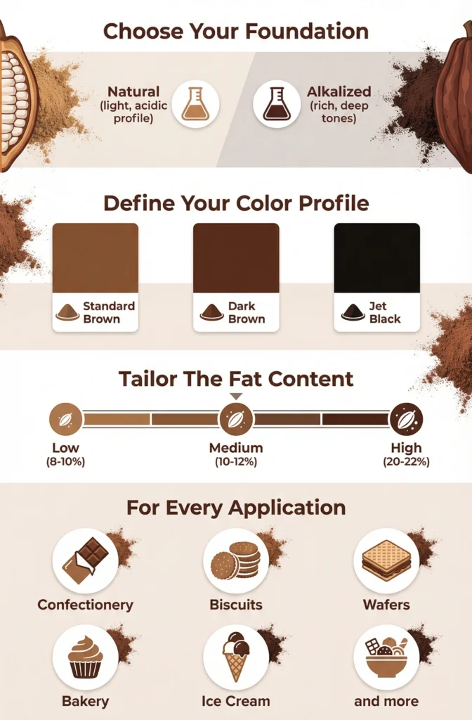 We understand that every end-product requires a specific cocoa character. Whether you need the acidity of a Natural powder for rising dough or the intense depth of Black Alkalized for cookies, we have the precise specification.